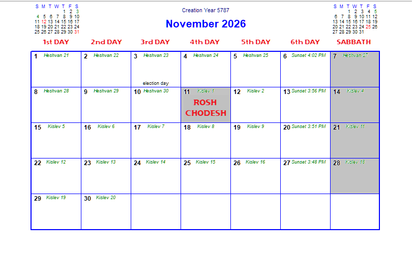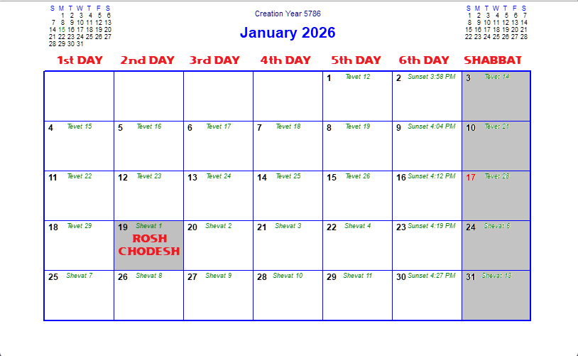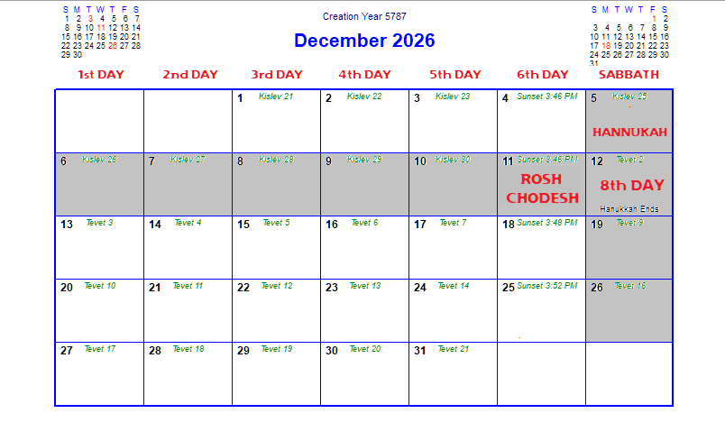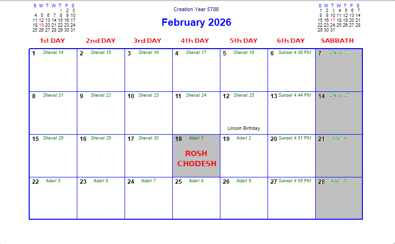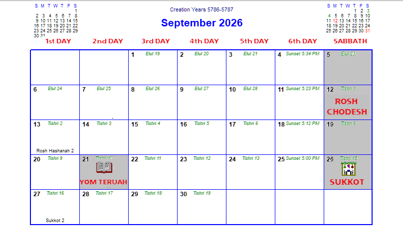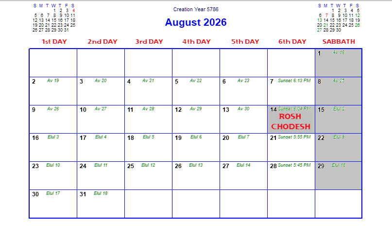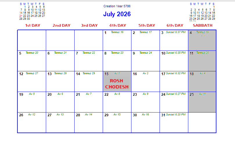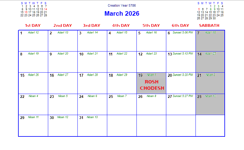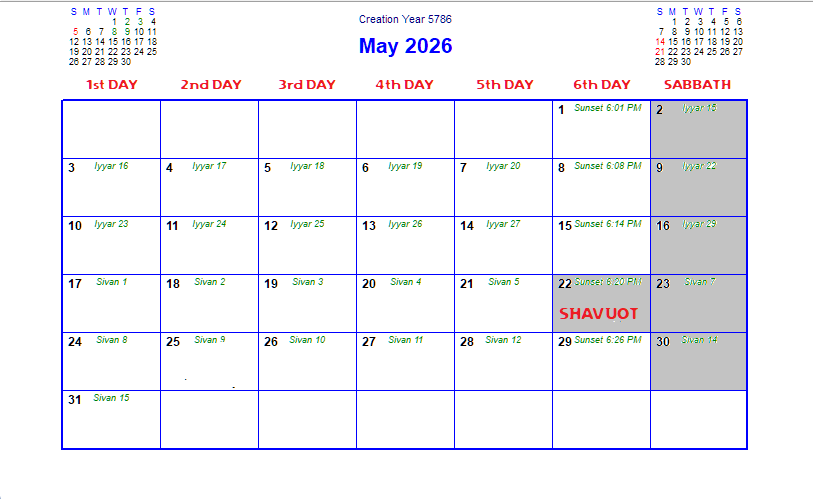 PLEASE! NOTE THIS DISCLAIMER! The HEBREW CALENDAR PROGRAM TEMPLATE used here would have in my opinion have been better served by its AUTHOR (Joel R. Grafman) were the MONTHS simply called “FIRST, SECOND, THIRD, FOURTH MONTH etc. …. As per the BIBLICAL REFERENCE. NOTE that where the BIBLE refers to the “MONTH of ABIB” (Exodus 13:4), this is what is called the FIRST MONTH of the HEBREW YEAR! The AUTHOR of this CALENDAR PROGRAM chose to use “TRADITIONAL NAMES” that arose amongst the HEBREWS during and since the BABYLONIAN CAPTIVITY.