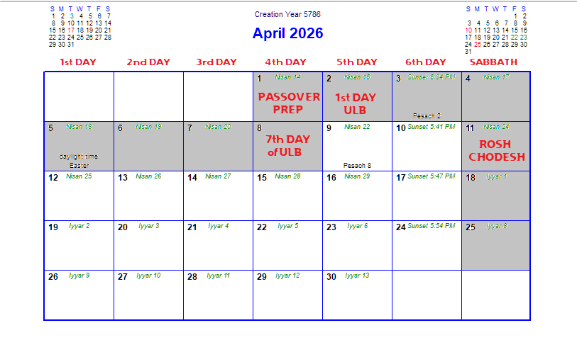 Please keep this in mind when taking note of “traditional calendars” for the year as set by today’s “rabbinical administrations” .. Biblical instruction accounts the DAY of PASSOVER and then SEVEN DAYS OF UNLEAVENED BREAD .. not eight. (See Leviticus 23:8)